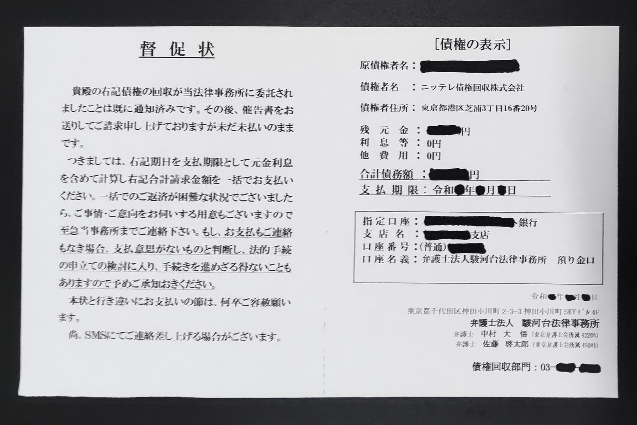 ニッテレ債権回収株式会社からの請求も無視すると、弁護士法人駿河台法律事務所へ債権回収業務が委託されることがあり、弁護士の受任通知や督促状が届いて支払いを催告されます。