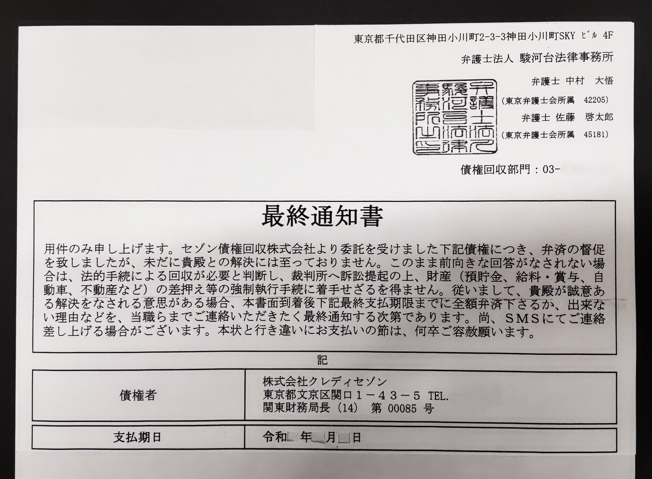弁護士法人駿河台法律事務所の最終通知書に記載されているのは、次のような内容です